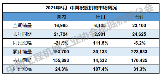 根据中国工程机械工业协会行业统计数据,2021年1—6月纳入统计的26家主机制造企业,共计销售各类挖掘机械产品223,833台,同比涨幅31.3%。其中,国内市场销量193,700台,同比涨幅24.3%;出口销量30,133台,同比涨幅107…......