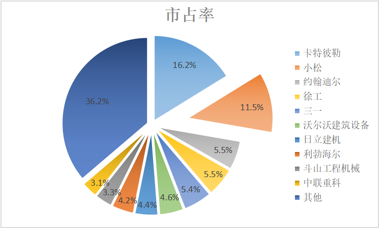 2020全球工程机械50强排名前10的分别是卡特彼勒、小松、约翰迪尔、徐工集团、三一重工、沃尔沃建筑设备、日立建机、利勃海尔、斗山工程机械和中联重科。前十大企业占据全球市场份额超过60%,达到了63.7%。
