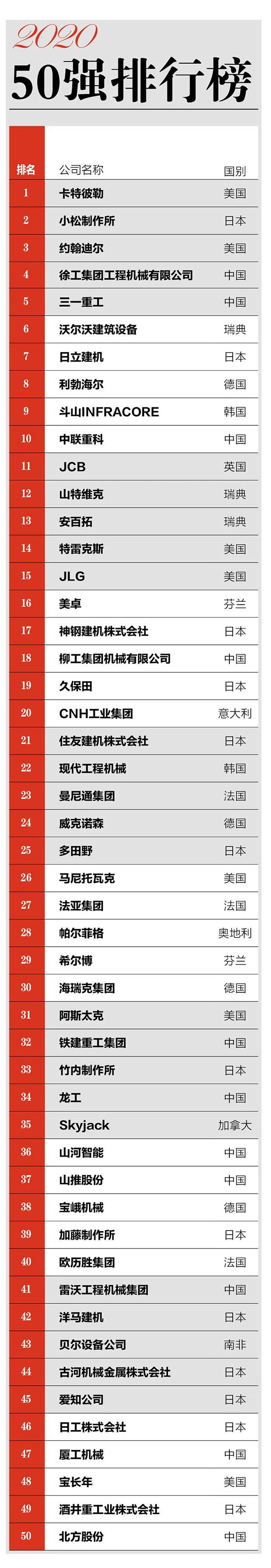 日前,2020年全球工程机械制造商50强排行榜在北京发布。截至2020年,由《中国工程机械》杂志制作的“全球工程机械制造商50强榜单”,已经连续发布19届。