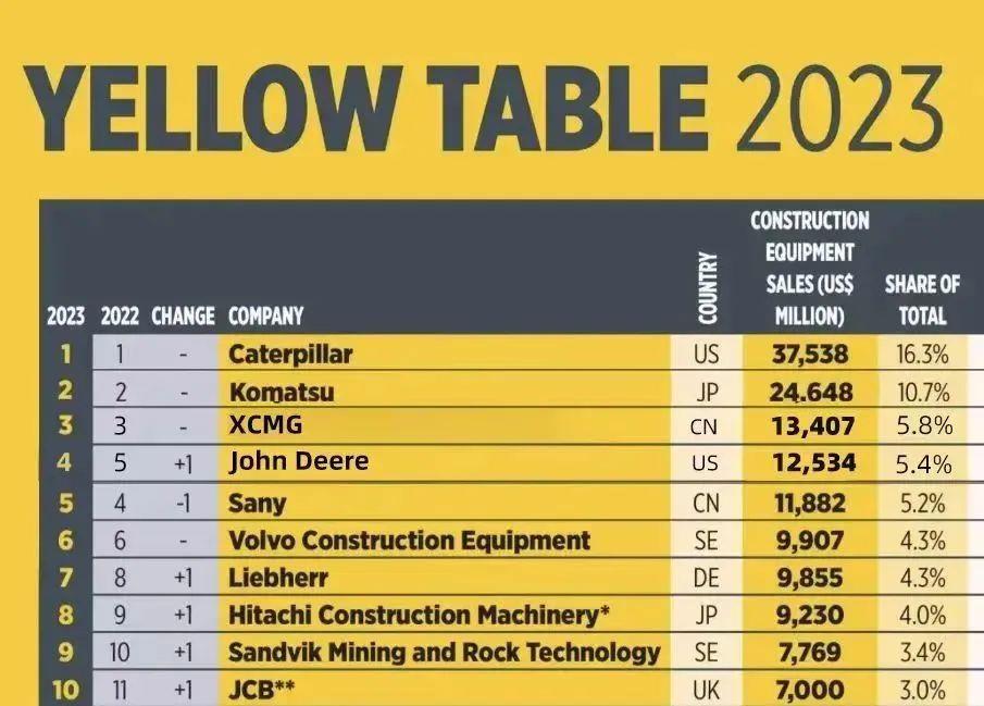 徐工(5.8%):稳居第三,名次不变,成为唯一连续三年跻身全球前三甲的中国工程机械制造商。