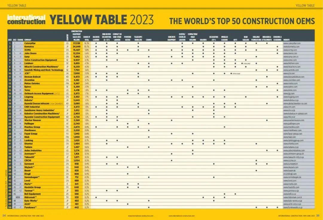 6月1日,全球工程机械行业知名资讯集团KHL旗下《International Construction》杂志权威发布Yellow Table榜单。榜单显示,TOP50工程机械制造商2022年总销售额为2306亿美元,为该榜单有史以来的最高数字之一。增长的一个重要原因是美国制造商业绩的增长,2022年美国制造商销售额占全球总收入26%以上,比2021年增加五个百分点。相比之下,中国军团整体排名略有下滑。